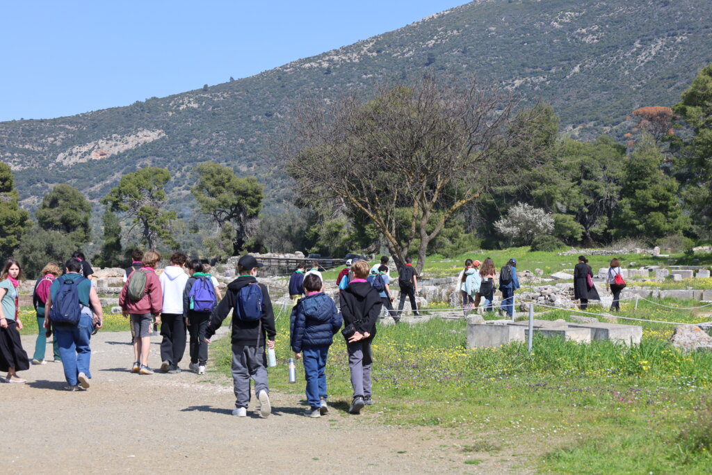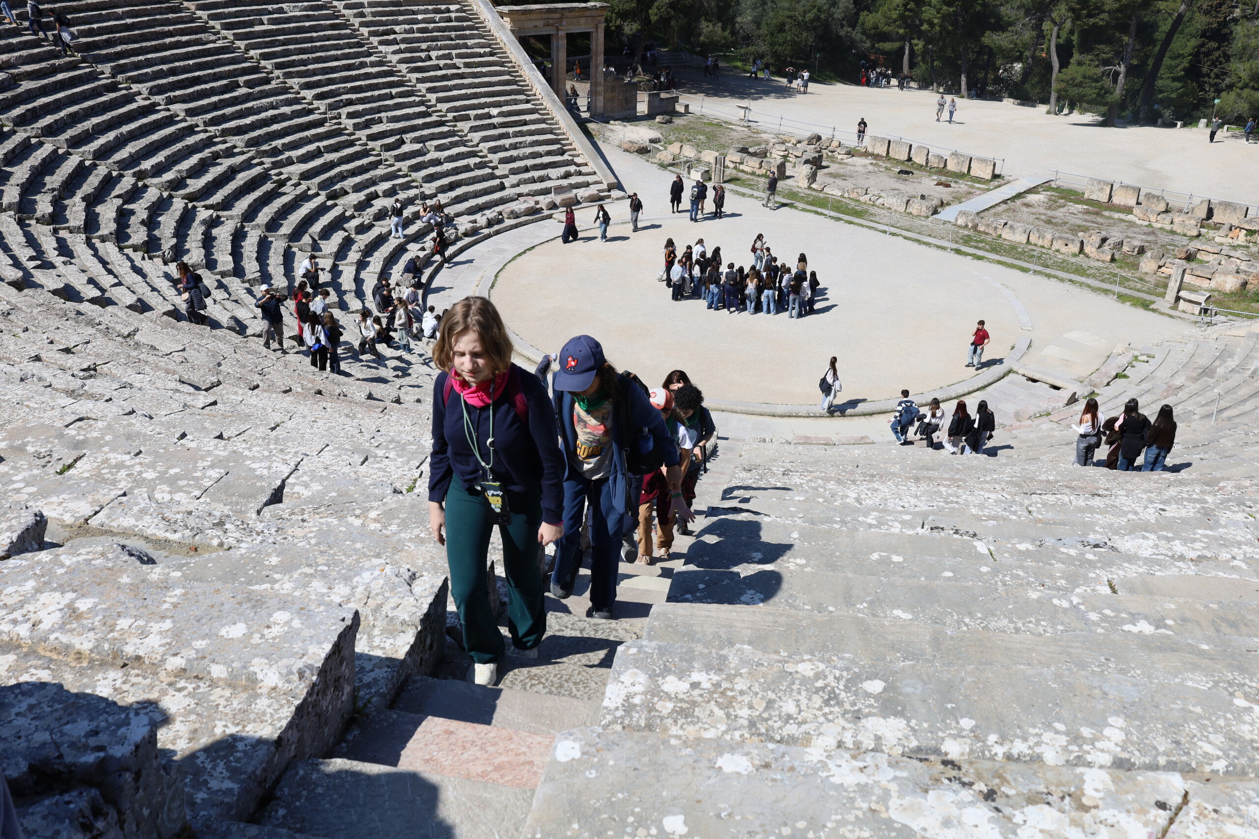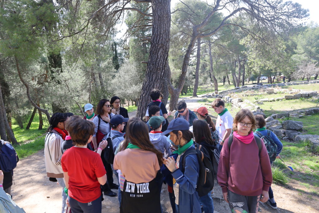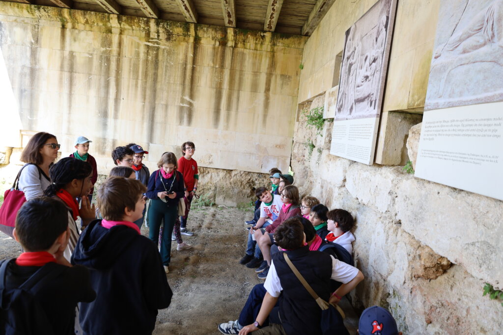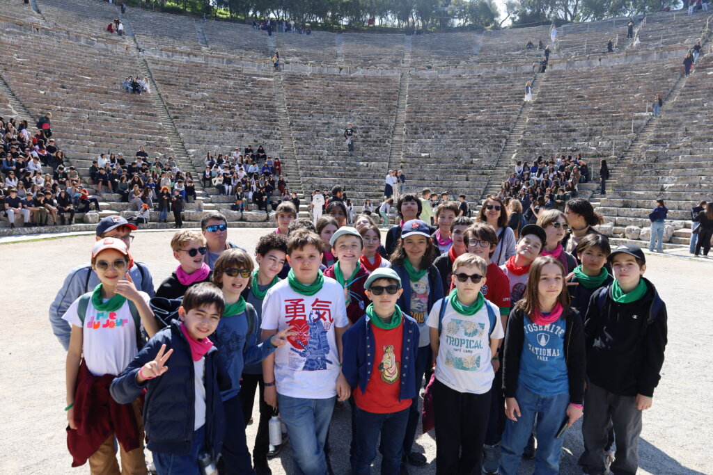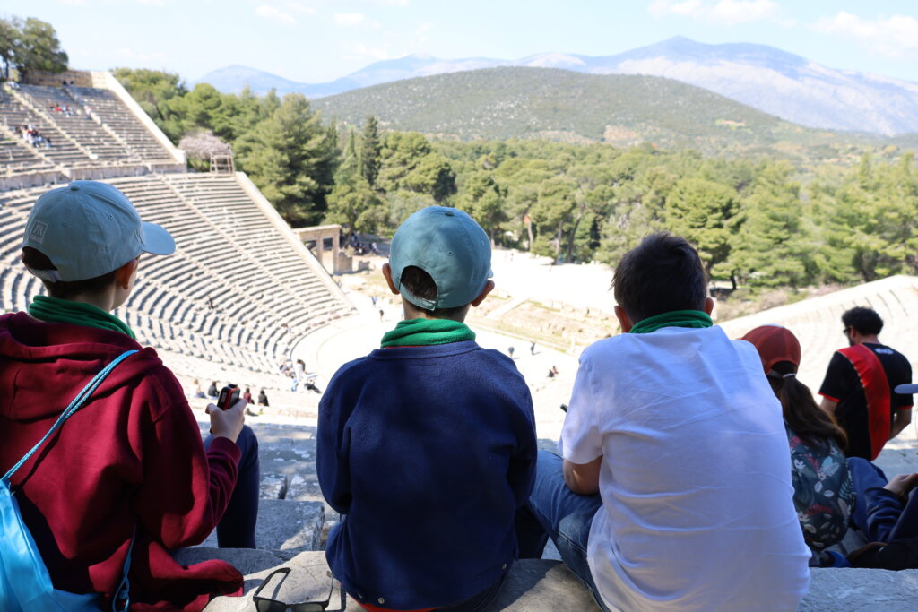 Nos élèves ont visité le Théâtre d’Épidaure, sous un grand soleil et une température très agréable. Le site a impressionné tout le monde, tant par ses dimensions que par sa célèbre acoustique. Répartis en deux groupes, des élèves ont pu se placer au centre de la scène tandis que leurs camarades se tenaient tout en haut des gradins. Même à cette distance, la voix portait parfaitement.