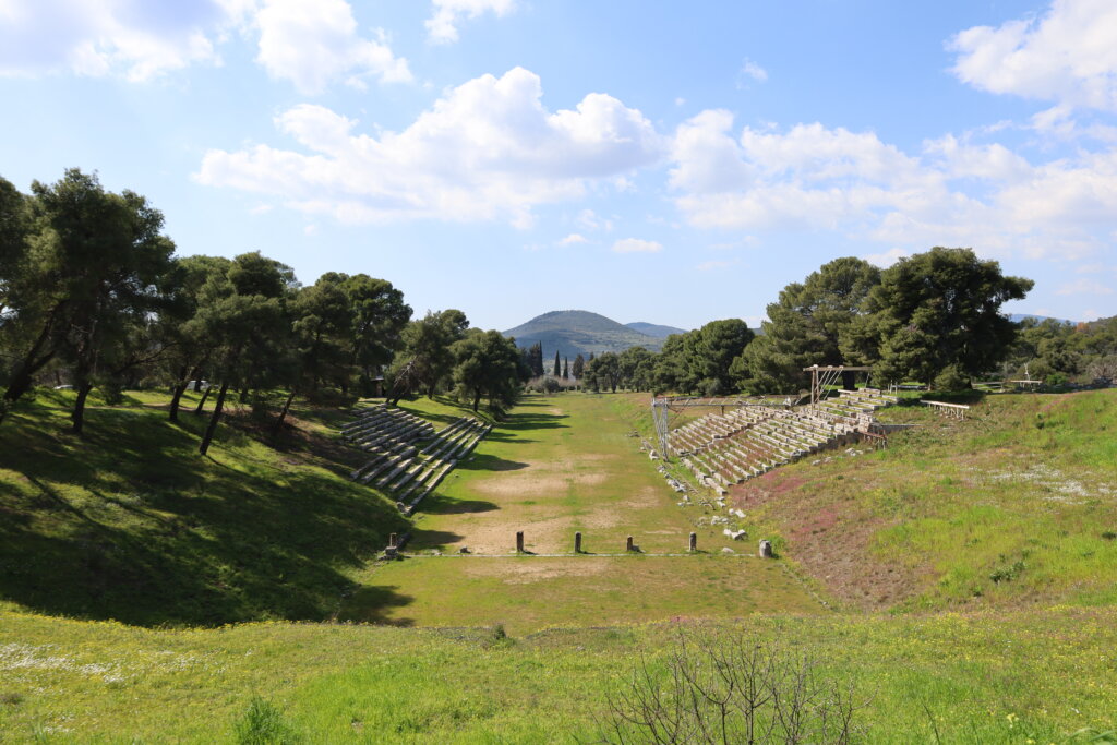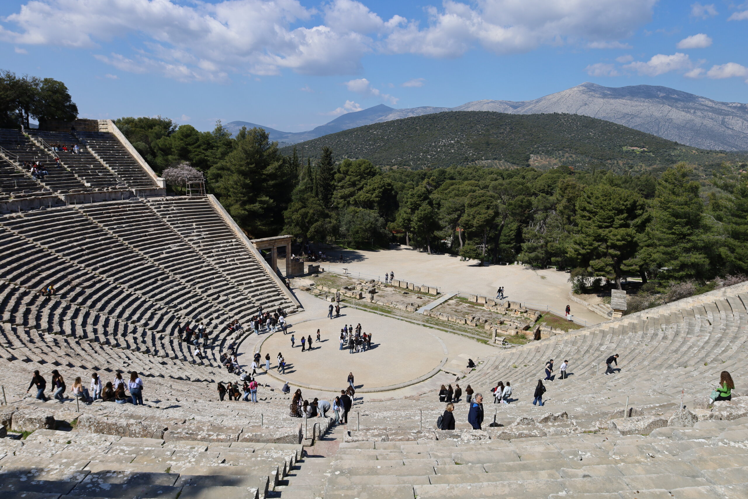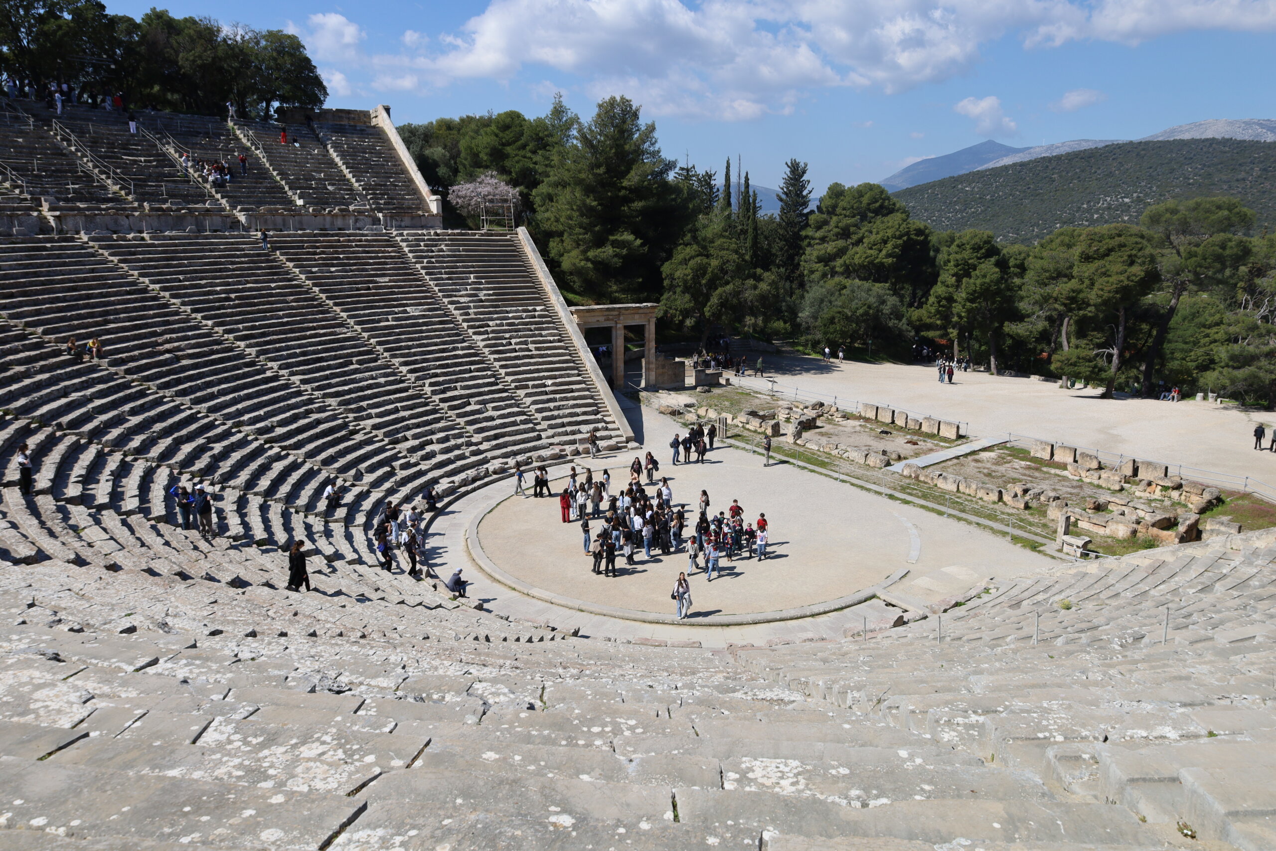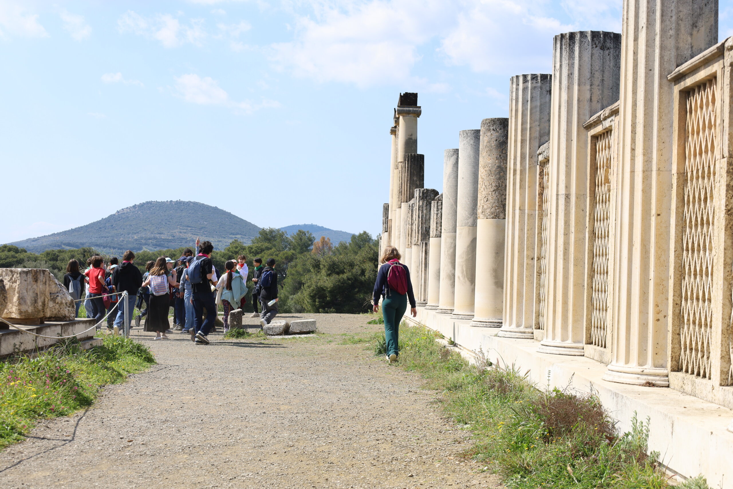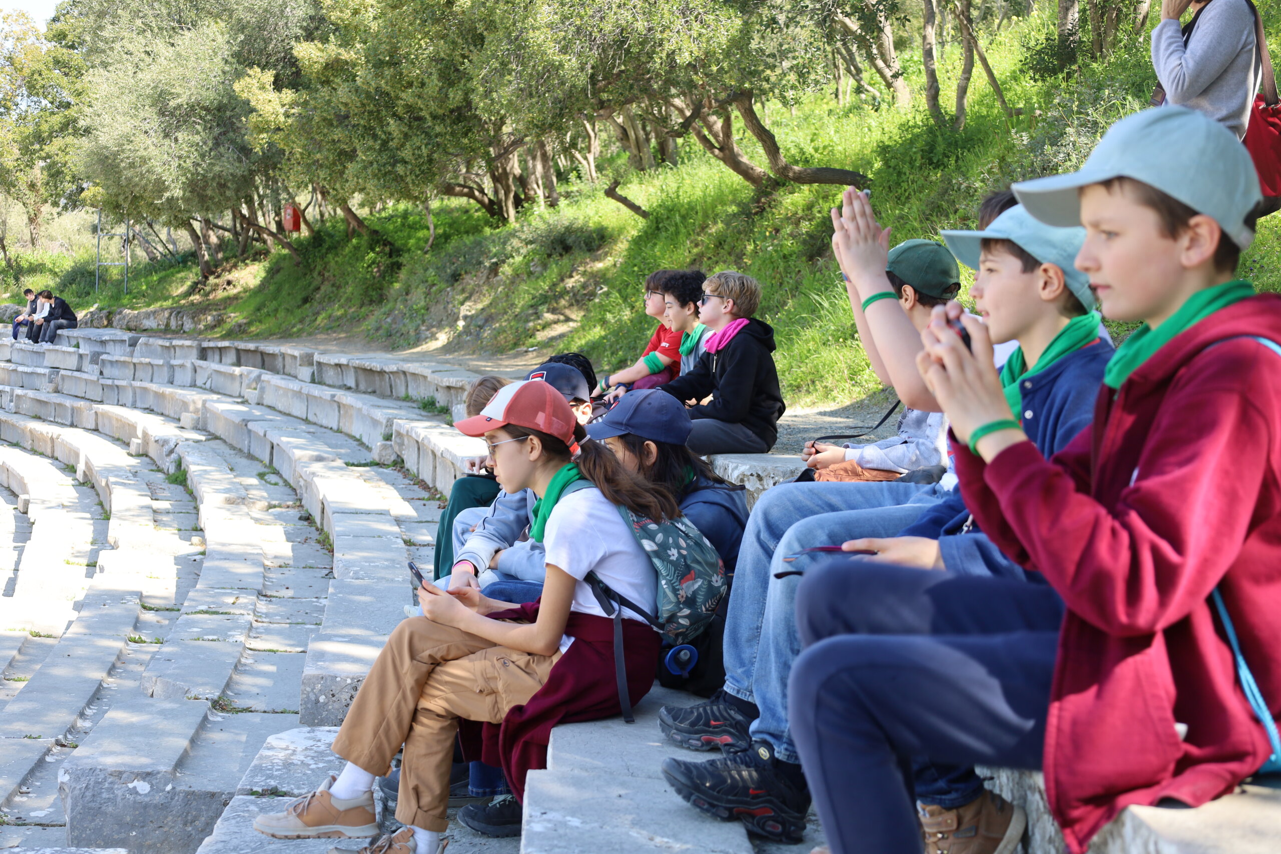 Nos élèves ont visité le Théâtre d’Épidaure, sous un grand soleil et une température très agréable. Le site a impressionné tout le monde, tant par ses dimensions que par sa célèbre acoustique. Répartis en deux groupes, des élèves ont pu se placer au centre de la scène tandis que leurs camarades se tenaient tout en haut des gradins. Même à cette distance, la voix portait parfaitement.
